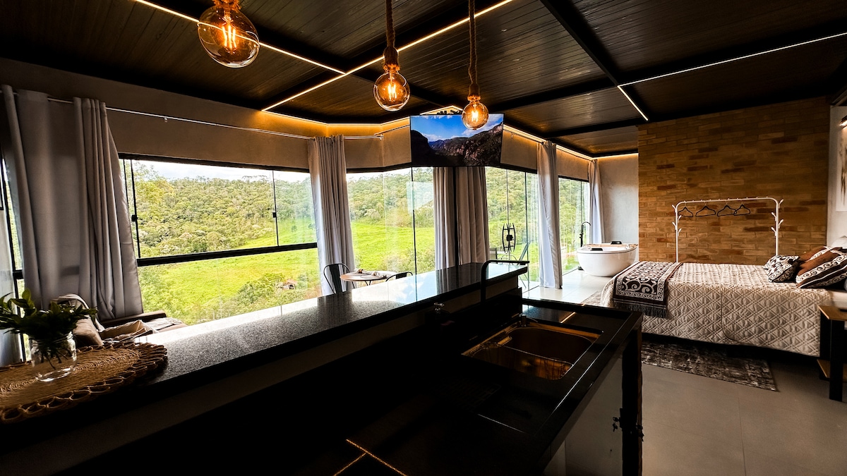 Descubrí el encanto de Serra da Mantiqueira en esta cabaña diseñada para que puedas contemplar el amanecer sin salir de la cama. Ven a relajarte en nuestro spa climatizado, contemplando las estrellas en el techo y la red de columpios. La cabaña tiene una habitación integrada con una acogedora cama tamaño queen. En la sala de estar/cocina, un futón súper cómodo tiene capacidad para dos huéspedes más, lo que hace que la experiencia sea ideal para familias. La propiedad también tiene senderos y pequeñas cascadas.