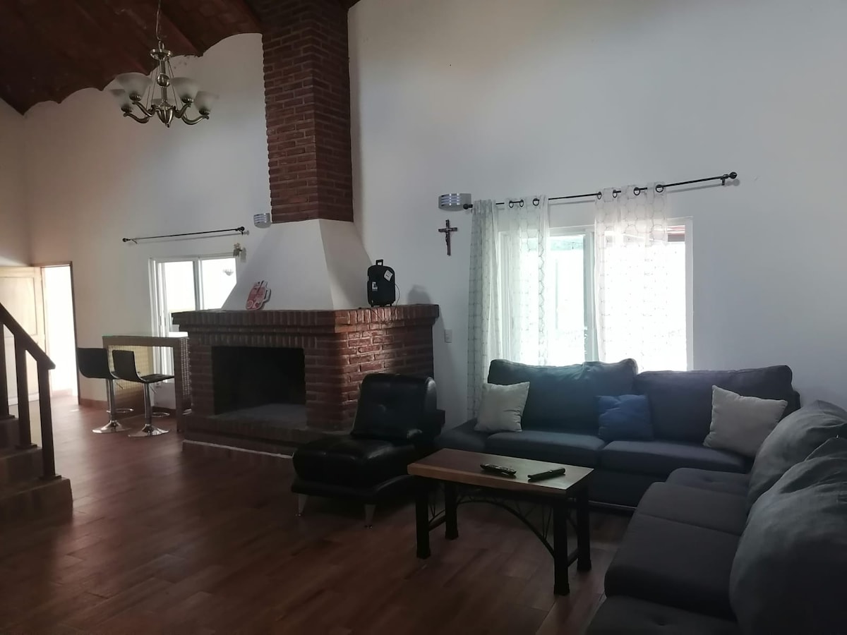Casa tipo Hacienda Con chimenea, un área de jardín muy amplio, donde sentiras La Paz de de la naturaleza, y podrás disfrutar de tardes con tus hijos y o carne asada con amigos y los niños pueden jugar y correr También contamos con alberca de 5 x4 tibia en meses cálidos fría en invierno WiFi, balcón con hamaca para disfrutar la vista Ideal para desconectarte de la ciudad. si estás cansado o estresado es el lugar indicado Estamos cerca de la barranca y zoológico de Guadalajara