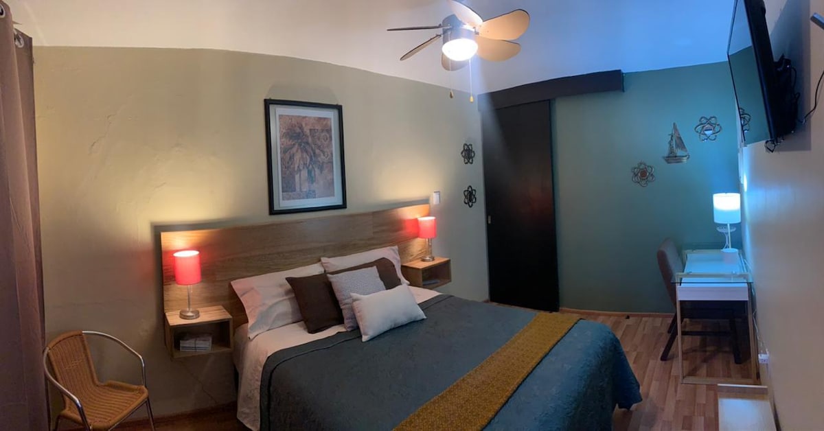 Disfruta de la comodidad de este "Estudio" tranquilo y céntrico. Ubicado en la parte trasera de mi casa con entrada independiente. Equipado con aire acondicionado, WiFi, Smart TV, además cuenta con estacionamiento cerrado y gratuito dentro de las instalaciones. Hay un patio grande y 2 terrazas compartidas en donde sí se permite fumar. La cama es tamaño matrimonial.