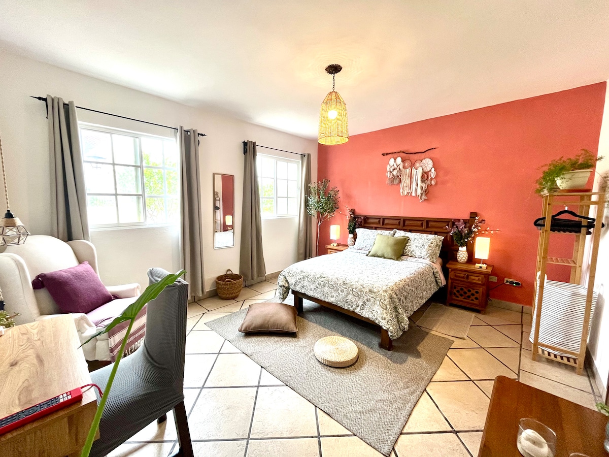 Ubicado en un entorno de jardín sereno, nuestro moderno estudio ofrece una escapada tranquila a pocos pasos del vibrante corazón de San Miguel. Disfruta de una estancia tranquila con comodidades contemporáneas: una lujosa cama tamaño queen, wifi de alta velocidad y zona de cocina totalmente equipada. Comienza las mañanas con un café en el patio privado, rodeado de una exuberante vegetación, y relájate por las noches con un paseo por las cafeterías, galerías y lugares históricos cercanos. Experimenta la combinación ideal de relajación y comodidad.