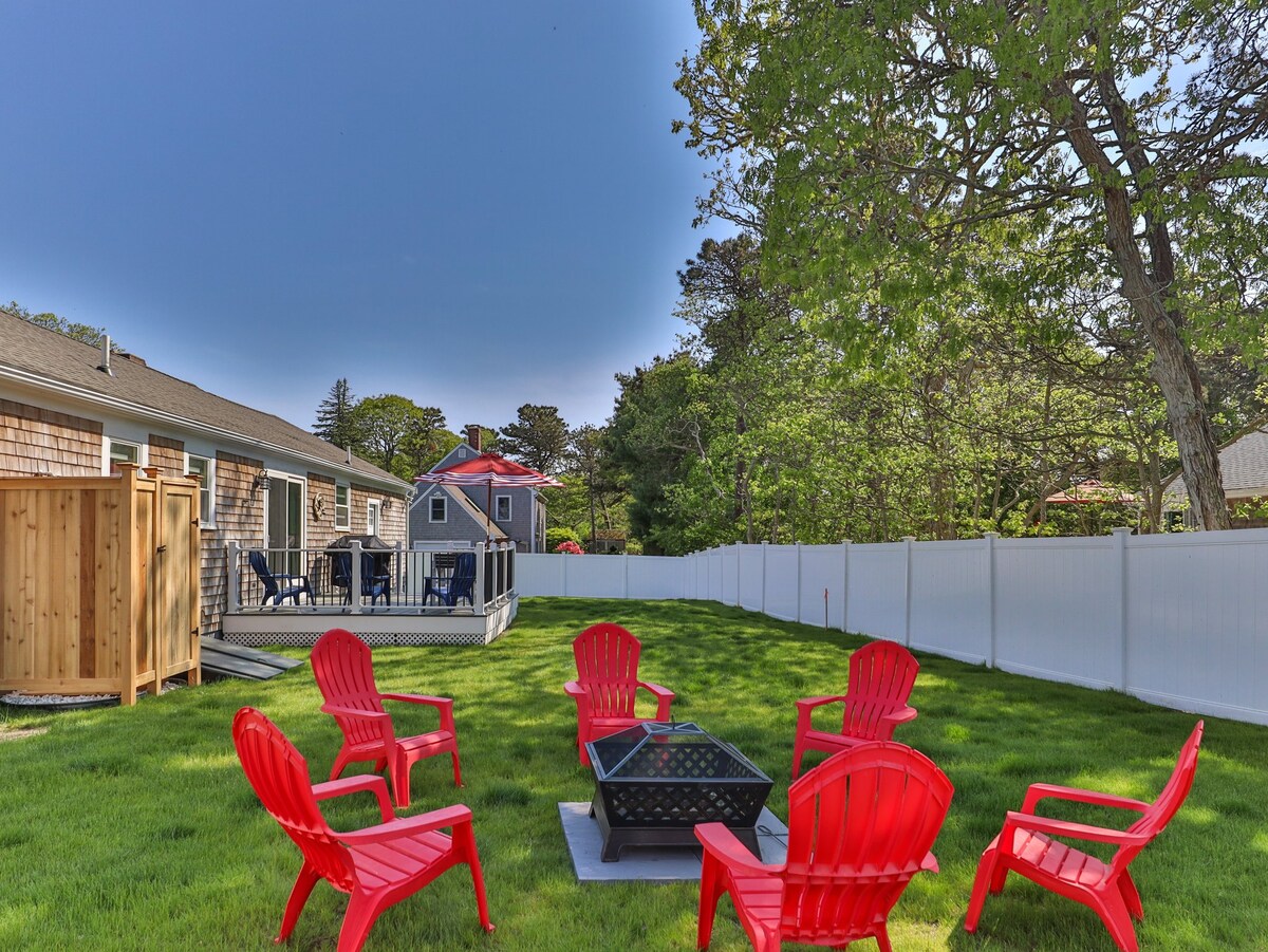 Moderna casa de 3 dormitorios, 2 baños completos de un solo nivel ubicada en Chatham a 1/10 de milla del carril bici Old Colony y a 1 milla de Forest Park Beach. A poca distancia en coche de otras playas junto al estrecho de Long Island Sound. La casa cuenta con wifi superrápido, aire acondicionado central, televisores inteligentes, cocina nueva, sótano recién terminado, colchones nuevos, valla de vinilo de 6 pies en el patio, ducha al aire libre, chimenea, parrilla de gas, gran terraza compuesta y lavadora/secadora. * SE ADMITEN PERROS * ¡Justo enfrente de 10 acres de tierra pública de conservación!