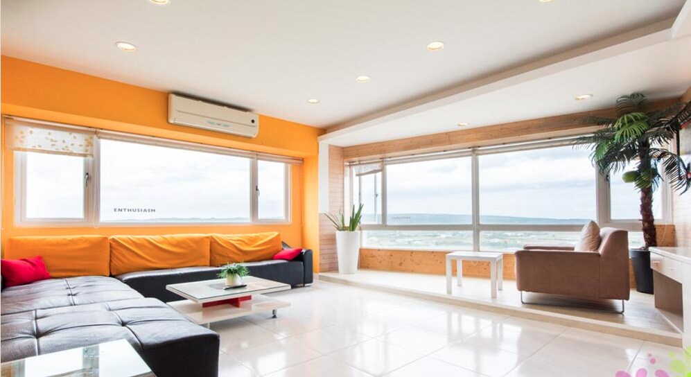 Habitación para 8 personas (56 tsubo).Hay una gran suite para 2 personas (cama tamaño king), una habitación para 2 personas (una cama tamaño queen) y una habitación para 4 personas (dos camas tamaño queen).La sala de estar puede ver las colinas (montañas costeras de Hengchun).