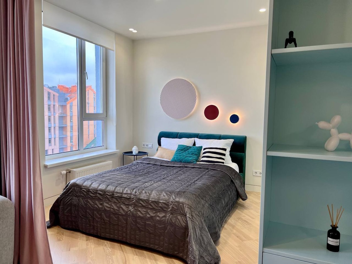 Modern luxury studio with balcony in the center of Kiiv, renovated in 2021. A large custom-made bed with a quality mattress (160x200) ensures comfort. Triple-glazed windows keep the apartment quiet and warm in winter. The compact kitchen is fully equipped. The bathroom has a clean modern shower and hot water from a boiler. Easy self check-in anytime after 14:00 via lockbox at the entrance. Metro station is just 400 meters away. The building is secure, well maintained, suitable for stays!