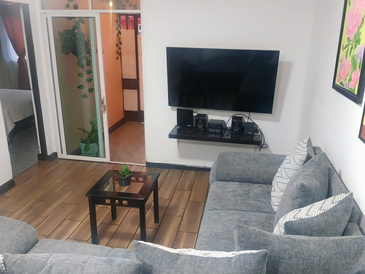 Casa de dos Pisos, cuenta con: 2 habitaciones una habitación con baño completo, sala comedor,cocina (refrigerador, horno de Microondas, licuadora, Estufa, utensilios de cocina) Cuenta con Internet patio de servicio, 2 baños completos y un medio baño, cochera, television de 50 pulgadas y una pantalla en la sala.