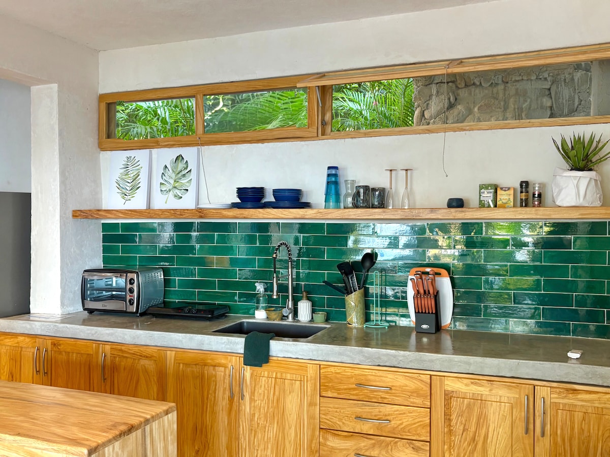 Casa Luna, nuestra escapada romántica, tiene una cama colgante tamaño queen en la planta superior con una vista espectacular del océano. También hay una sala de estar y una hamaca construida para dos. En la planta baja, hay una cama tamaño queen y una cama/sofá individual. Luna tiene una cocina totalmente equipada con una vista que da al mar. La estufa está a cuatro fogones, lo siento, no hay horno.