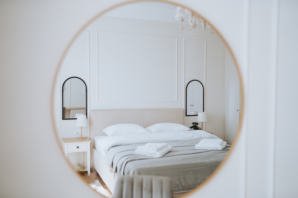 Spacious, central & quiet. Two elegant bedrooms (180×200 cm & 160×200 cm beds) with premium bedding, fully equipped kitchen, 65″ Smart TV, high-speed Wi-Fi. Thoughtfully stocked with coffee, tea, chocolates, dishwasher & laundry detergent and more. Temperature control with AC & heating. Gated courtyard with safe playground. Drop luggage by entrance (30 min car access).Free street parking nearby. Cafés, markets, parks & trolleybuses a short walk. Spotless & secure. Self checkin. GrandStay quality