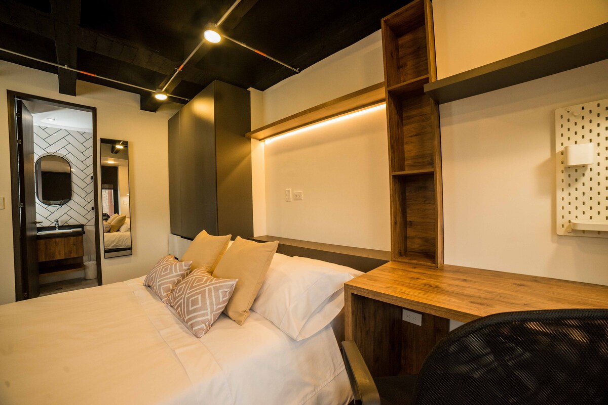 Disfruta de este aparta estudio tranquilo, cómodo y bien equipado, ideal para que tengas una buena estadía. Ubicado a pocas cuadras del centro de la ciudad, en un lugar bastante tranquilo y de fácil acceso desde los centros comerciales y universidades. Cerca de rutas de transporte público y de comercio básico (droguería, panadería, supermercado, restaurante, salón de belleza, etc) Frente al edificio tenemos una amplia zona verde, segura y tranquila. Bienvenidos!!