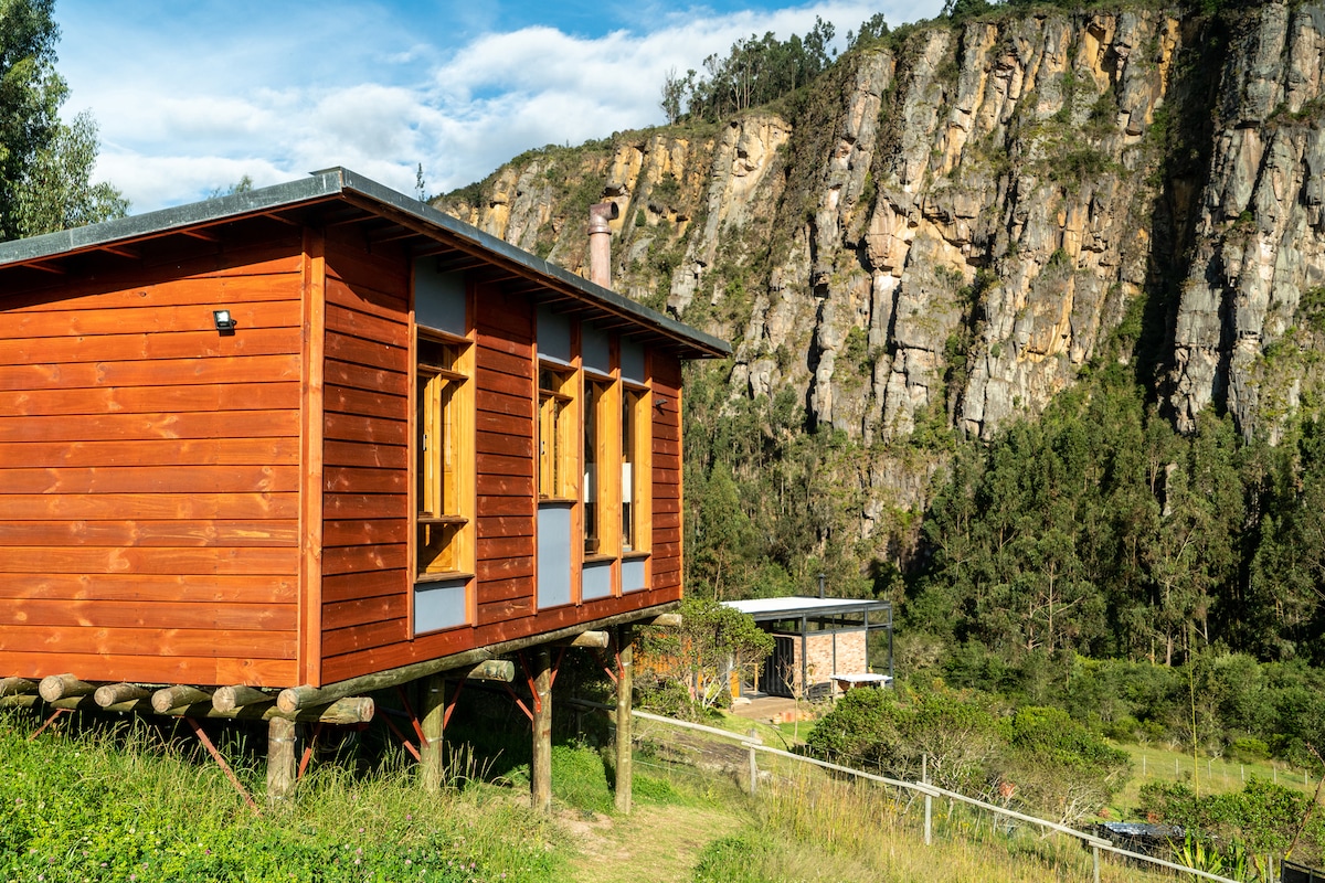 Acogedora cabaña en madera para hasta cuatro o cinco personas. Paraíso de escalada en roca. Completamente equipada para su comodidad en el mejor lugar de Suesca. La finca Manodeoso es un laboratorio de vida alrededor de la permacultura, la agricultura orgánica y los deportes al aire libre.