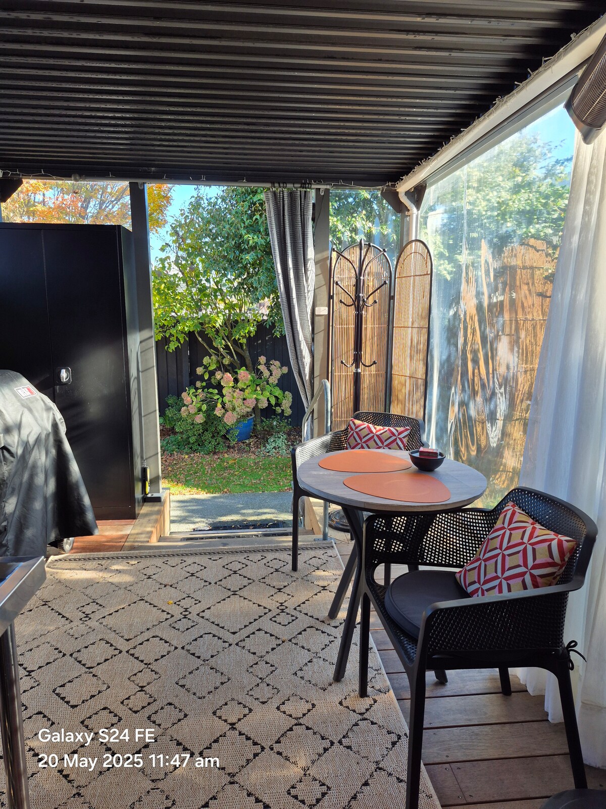 Tree lined Maidstone Road, leads you up our driveway, through to our private, tranquil garden. The path takes you up the steps onto deck, with enclosed kitchen, where you can enjoy outdoor dining while taking in our beautiful garden on a sunny day. Recent guest: "A Glamping Experience" Studio sleeps 1-4 Ideal for 2 couples or (1 couple, 2 children) Extra guests $30.00/pp per night. Pre-ordered Continental Breaky by request $12.00/pp. (take unused food to stock up for your trip)