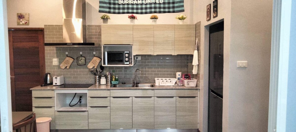 Alojate en el corazón de la ciudad y viajá con toda la familia. Disfrutá de una experiencia en una casa recién renovada con estilo minimalista. Hogareño. Quedate en el corazón de la ciudad de Buriram. Cerca de Chang Arena, un hipódromo de clase mundial. A solo 3 minutos de centros comerciales y mercados. Hay una cocina con cocina caliente. Es como vivir en tu propia casa.