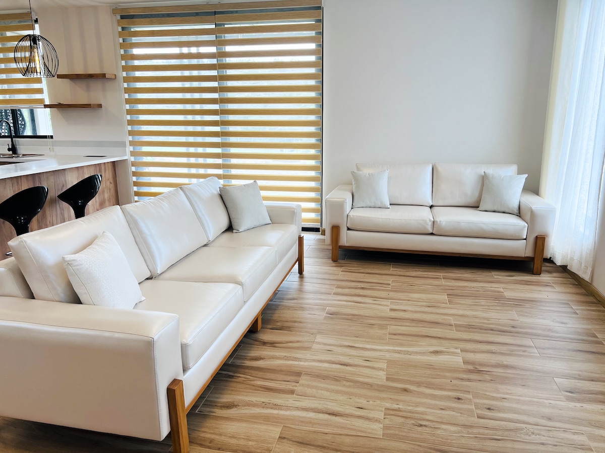 Este elegante alojamiento es ideal para noches de pareja, familia corta o estadías largas de trabajo. Contamos con jacuzzi dentro del departamento, chimenea de bioetanol y una sala con una pantalla de 85” para las mejores noches y experiencias inolvidables de sus vacaciones. Cama tamaño king y hermosos balcones. Cocina propia con todos los implementos necesarios. Cerca de lavanderías, tiendas, restaurantes. Parqueadero propio y cámaras con vista a la calle para su tranquilidad.