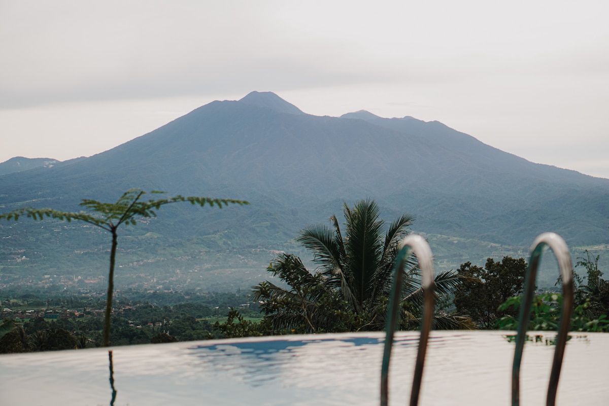 Villa kigai con experiencia en granja de café y flores, rodeada de naturaleza y vistas a la montaña. Escapate a un refugio tranquilo en un pueblo encantador en la base del monte Salak, con vistas impresionantes del monte Gede, el monte Pangrango y las luces de la ciudad por la noche. Nuestra villa ofrece una estadía única donde la naturaleza, la comodidad y la cultura local se unen, con una experiencia práctica de cultivo de café y flores.