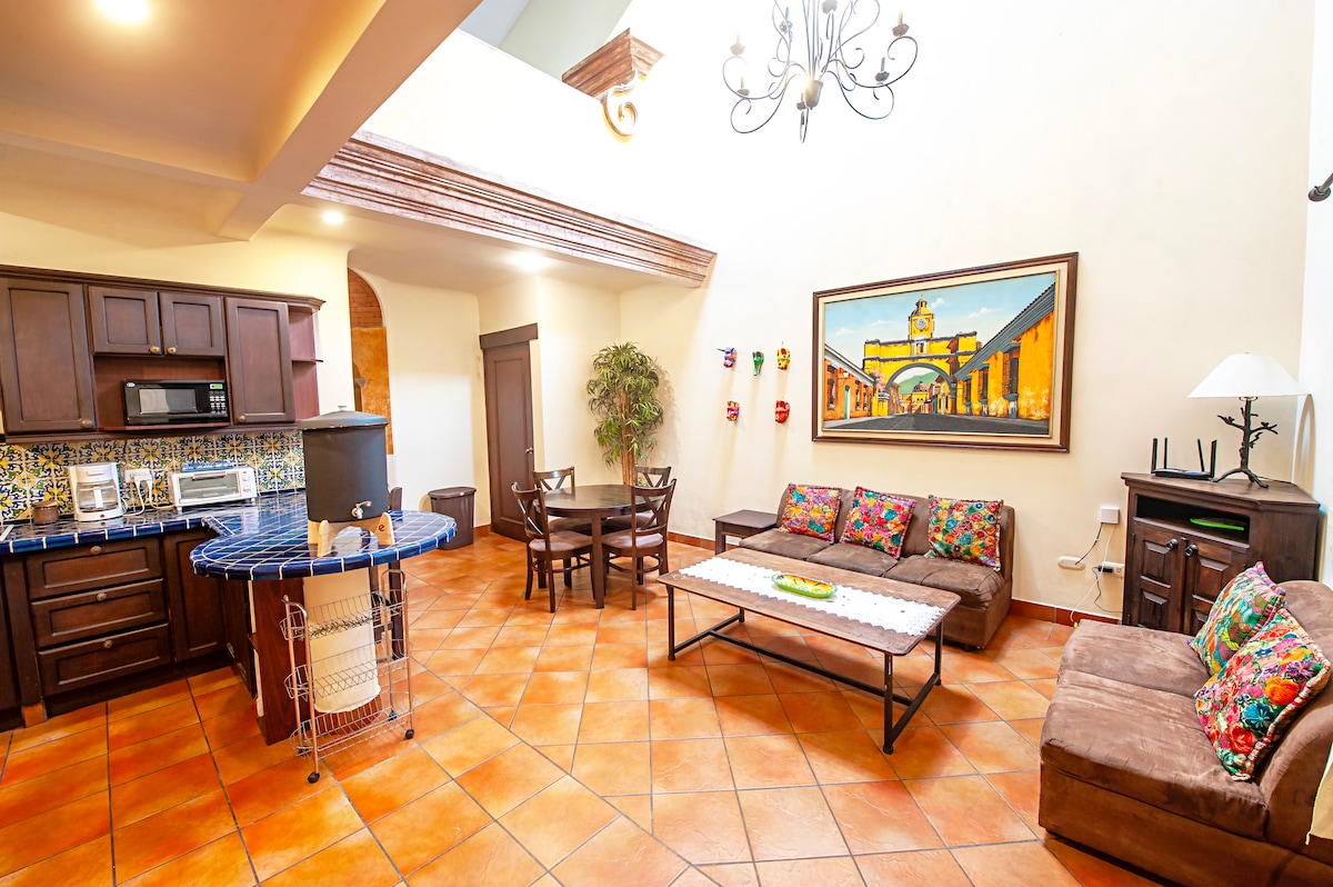 Apartamento bien equipado. Es un lugar para descansar en pareja, con familia o viaje de trabajo. En el primer nivel sala con chimenea, comedor para 4 personas, cocina bien equipada con todos los implementos incluso para hornear. Segundo nivel la habitación con chimenea, un escritorio para trabajar, 2 camas matrimoniales, baño con tina y ducha. Internet de alta velocidad, excelente café guatemalteco para su estadía y todos los implementos para cocinar.