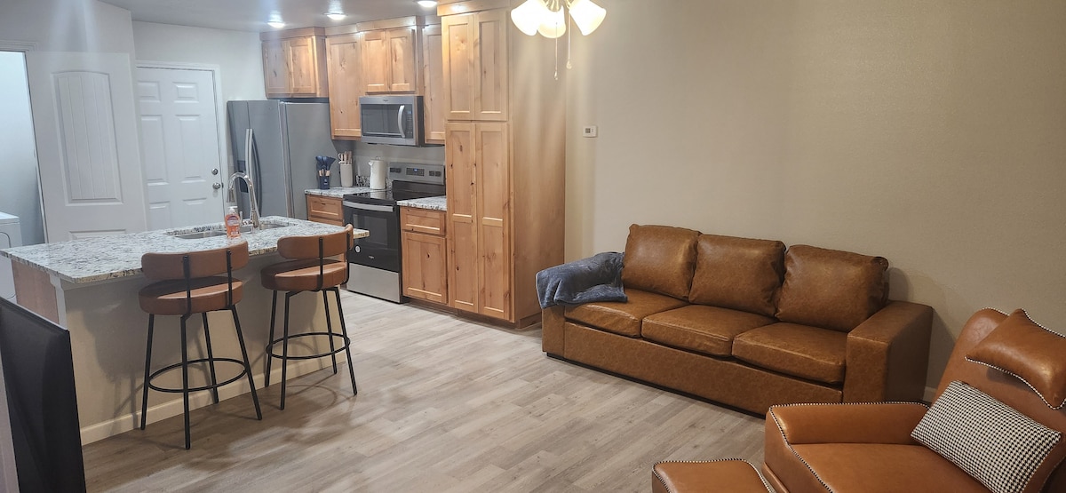 The Roadrunner Suite offers a comfortable, well-appointed stay for professionals or couples seeking overnight accommodations or extended lodging. Featuring a queen-size bed, sleeper sofa, full kitchen and dining space, along with complimentary Wi-Fi and parking, the suite blends productivity and relaxation with ease. Shared washer and dryer available.