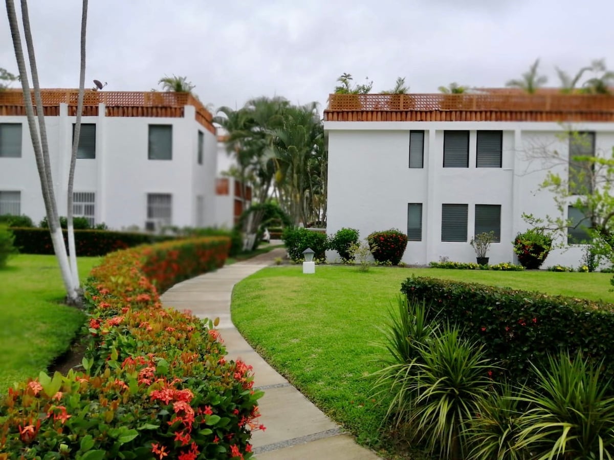 Cozy 1 bedroom +den apartment with breathtaking view of the Pacific Ocean and Playa La Audencia. 5 min walk to the beach. You can enjoy private pool. WIFI and 2 smart TVs available. 2 twin beds, 1 of them has a trundle bed available. 1 double bed. Walking shower, 2 AC units. Walking distance to Tesoro Hotel and 2 small restaurants and Kiosko. 5 minutes drive to Las Hadas Hotel, Walmart and Soriana. Taxi and bus #8 available in the front gate.