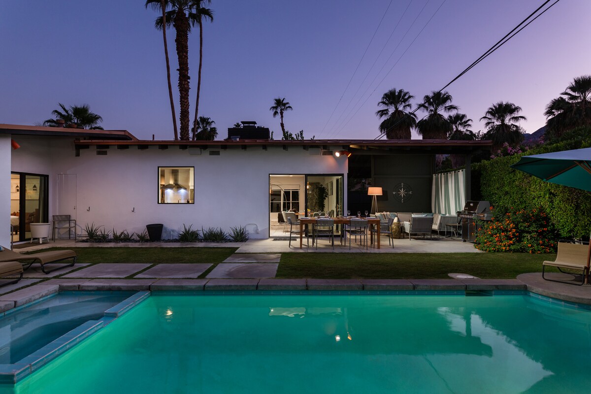 Casa de dos dormitorios con casita privada adicional de un dormitorio con baño privado. Ubicado en Taquitz River Estates, en una calle lateral tranquila y cerca de muchos de los mejores restaurantes, cafeterías y tiendas de Palm Springs. Relájate en la piscina de agua salada, en el jacuzzi disfrutando de las increíbles vistas rodeadas por un patio privado, en la ducha al aire libre o disfruta del salón al aire libre y del comedor. Número de identificación de la ciudad: 4222.