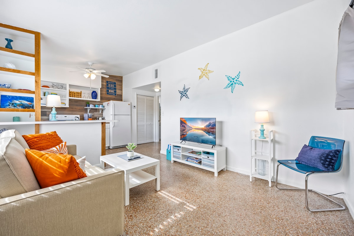 Disfruta de Cocoa Beach y de la arena entre los dedos de los pies en este estudio privado de Coastal Haven con cocina totalmente equipada, baño con ducha y todas las comodidades. Se proporciona toda la ropa de cama, TV de 50 pulgadas con cable de transmisión y wifi, purificador de aire HEPA, toallas de playa, sillas, sombrilla y carro de playa también. Vallado en una zona de patio con jardín privado con mesa de comedor y sillas, lavadora y secadora disponibles, apto para perros, aparcamiento en la calle, llegada autónoma con teclado y a solo unos pasos de la playa.