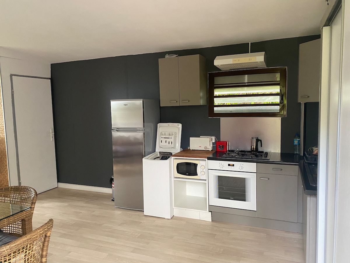 Joli et grand F2 (53m2) tout équipé (VENTILATEURS dans pièces principales) pour 2 personnes, en rez de jardin d'une villa avec 2 gentils chiens dans quartier calme (PK7) à 15 minutes du centre ville en voiture. Centres commerciaux proches ainsi que de nombreux commerces de proximité, à 5 minutes du Médipôle. Un petit espace devant le F2 protégé par un store extérieur et attenant au jardin permet de se détendre et de profiter de la tranquillité des lieux.