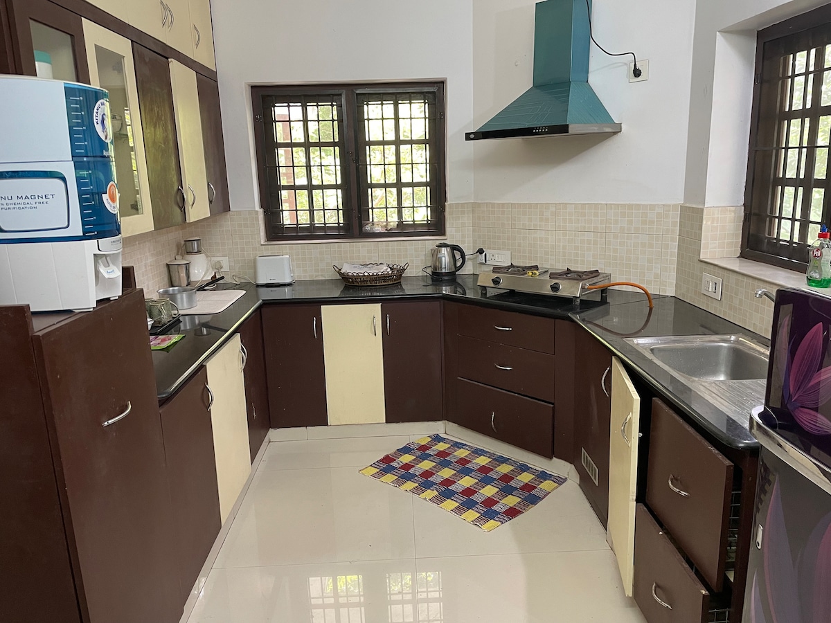 A calm, architect-designed home created for relaxed and luxurious family stays. The house features four spacious bedrooms with high ceilings, wooden furniture, and abundant natural light. Open living areas including a serene water courtyard, A cozy library, wooden swing, long dining hall, and a spacious kitchen make it ideal for slow, comfortable stay. Thoughtfully designed with warmth, light, and privacy, this is a home meant to be lived in—not just stayed in.