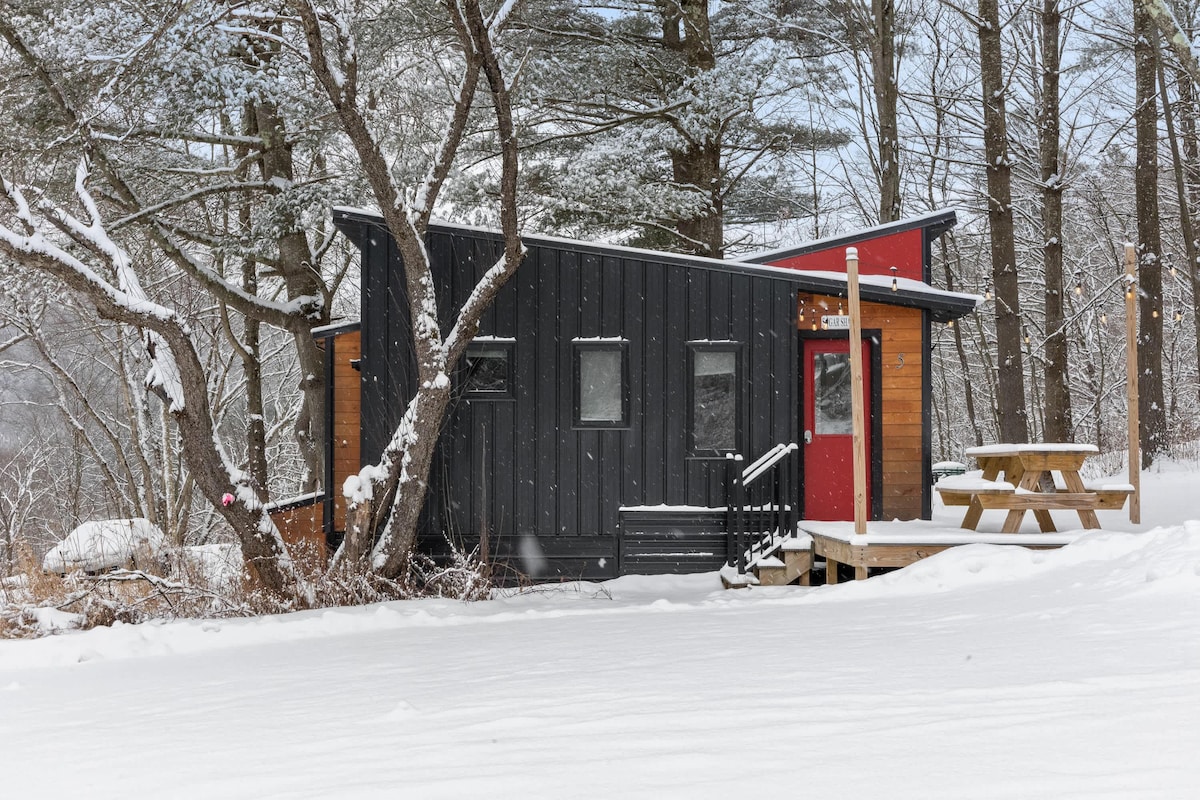 Welcome to The Maple Sugar Shack, a cozy tiny house along the Lamoille River in Johnson, Vermont. Guests enjoy access to a shared riverside spa experience with a year-round hot tub, treehouse barrel sauna, and river access for cold plunges. With Buffalo check décor, local maple touches, Green Mountain views, and nearby skiing, hiking, and zip-lining, it’s a perfect Vermont getaway.
