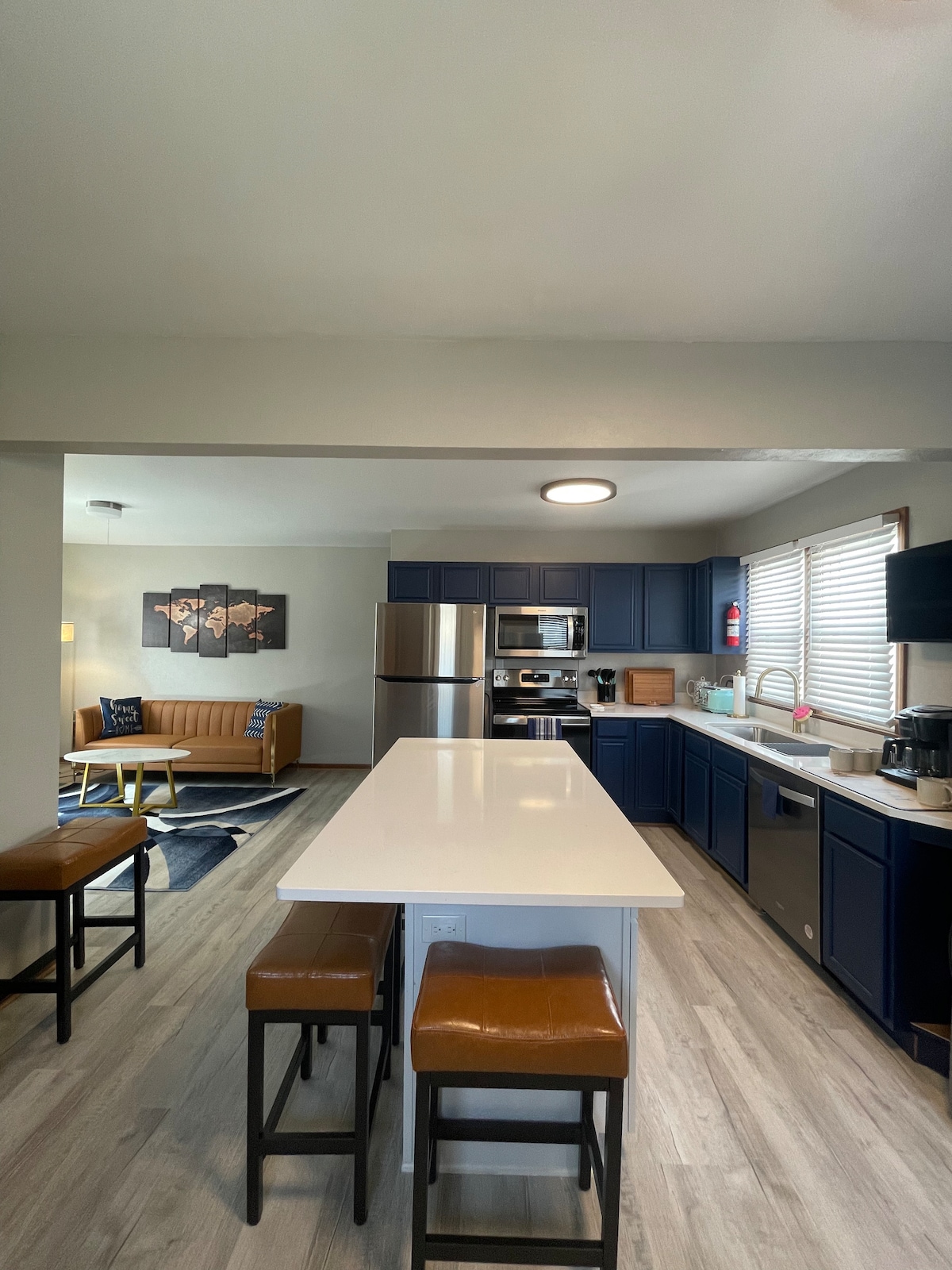 Ideal for travelers looking for a clean, comfortable place to relax after a long journey. Each room includes a private bathroom, a queen-size bed, a twin-size bed, and a remote-control TV. Guests also have access to a washer and dryer for added convenience. The living room features a full-size pull-out sofa bed, providing additional sleeping space. You'll also find a fully equipped kitchen stocked with all the essentials, perfect for cooking meals during your stay.