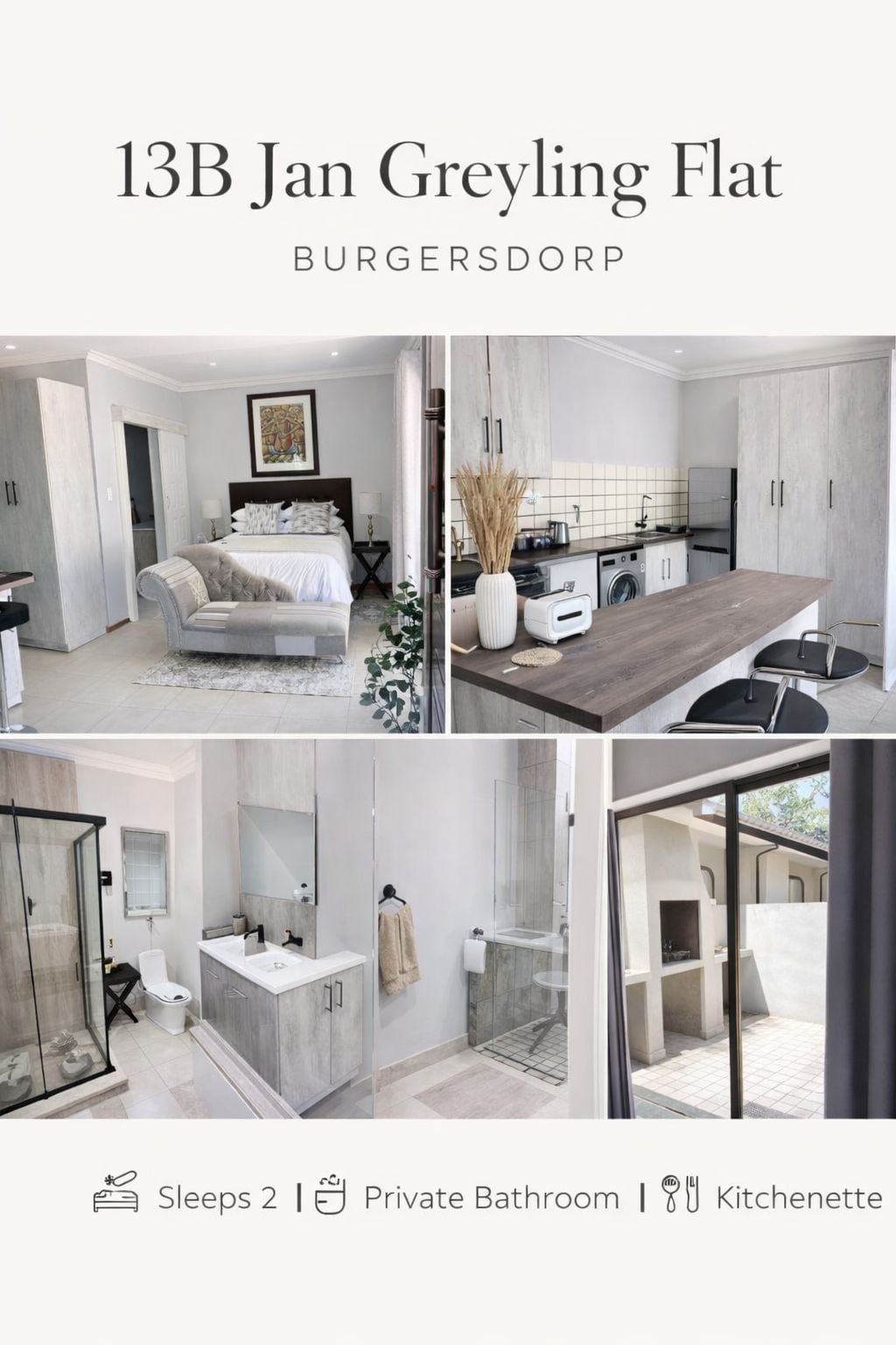 Modern 4-Star [studio style] guest house for two adults. Ideal for traveling couples, stop-overs, reps and working professionals. 2min walk from famous coffee shop and restaurant, Hagenhuis. The unit is private. Queen size bed, WiFi, Smart TV, Kitchenette with kettle, fridge and microwave...and complimentary rusks.