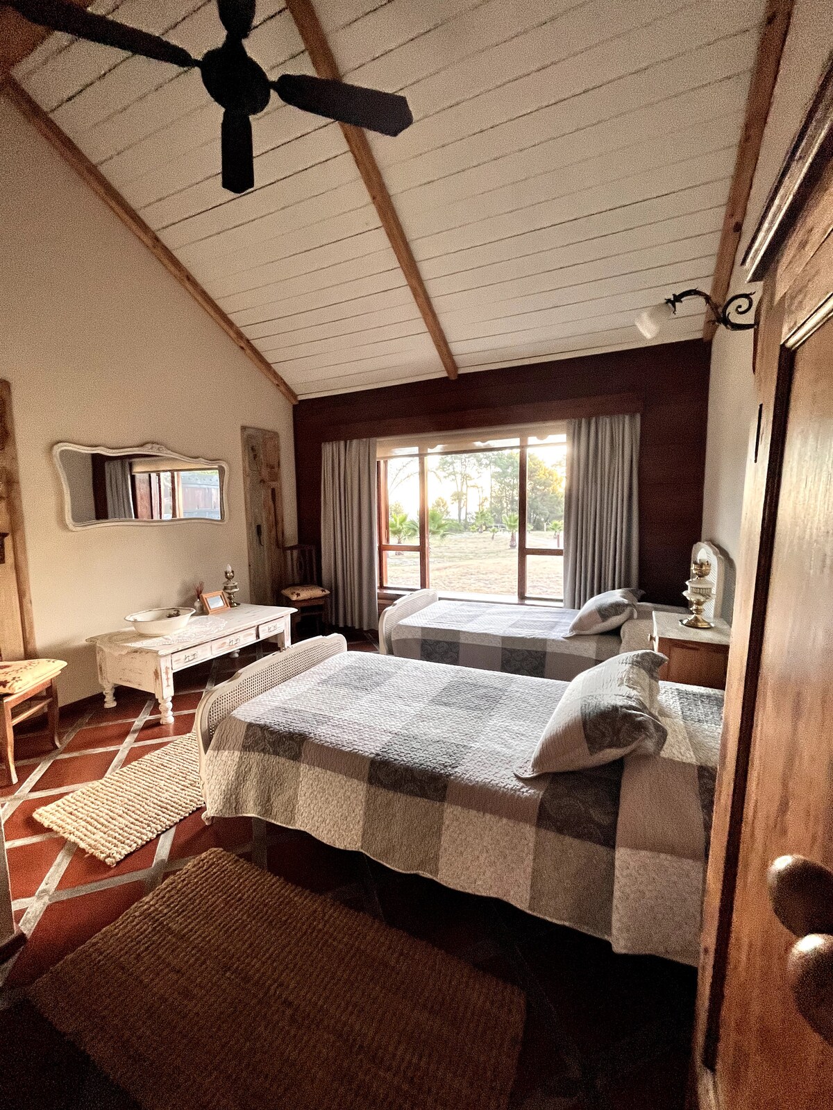Hermosa casa de campo para disfrutar en familia o amigos o en escapada romántica en una estancia de 60 hectáreas con caballos, vacas y ovejas diseñada por un empresario Sudafricano. Es super fresca y sus muebles son traídos del mundo entero. Cuenta con 5 camas Incluimos la ropa de cama, solo debe traer sus toallas. Son 2 dormitorios, cocina ampia y un living comedor súper espacioso. Hermosa costa privada con muelle flotante y pasarela además de una rampa para bajar embarcaciones deportivas.