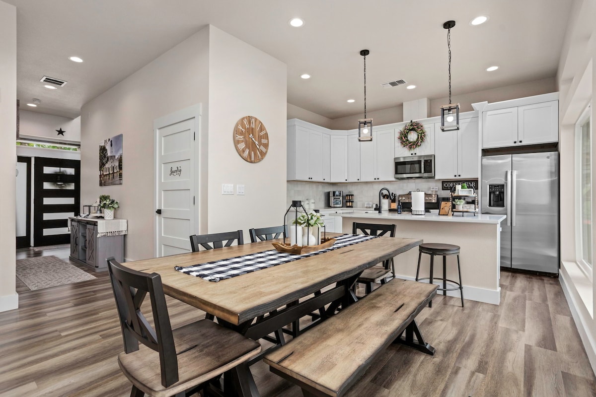 Spacious 4BR, 3.5BA lake-view retreat with hot tub, fire pit, playscape, and large open patio. Master suite downstairs with a king bed, garden tub, and shower. Upstairs: 2 queen beds + crib with ensuite, queen room with balcony, and bunk/trundle combo. Double oven kitchen, dining for 8, second fridge, sauna, foosball, office space, and kids’ books. Covered patio with grill and fireplace. Two kayaks included. Minutes from the Guadalupe River and Canyon Lake.