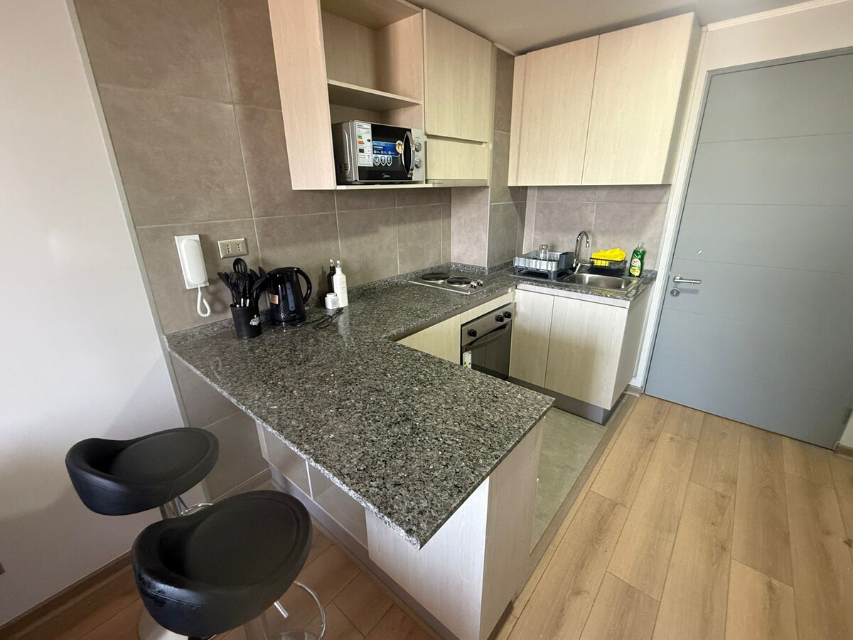 Departamento acogedor y full equipado en excelente ubicación! - 1 dormitorio cómodo y luminoso con televisor para una relajación completa - 1 baño completo y moderno - Sala de estar con televisor y acceso a Netflix y más - Equipado con todo lo necesario - Terraza perfecta para disfrutar del aire libre y relajarte - Internet de alta velocidad - Estacionamiento privado para mayor comodidad y seguridad Excelente ubicación: - A pasos del Hipódromo de Santiago - A solo 1 cuadra del metro Conchalí
