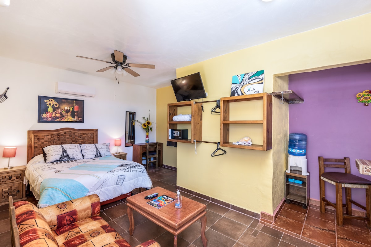 Habitación en Hotel Amaca a 4 cuadras de la playa. La hab cuenta solo con lo siguiente: con 2 camas queen size, 1 baño completo, aire acondicionado, televisión con cable, y amenidades. SIN VISTA! Lee cuidadosamente: Nuestro espacio NO es recomendable para personas con movilidad limitada. TODOS los accesos al y en el hotel son por medio de escaleras. Escaleras! Sí!Muchas escaleras! Petfriendly, restricciones y costo extra! Only Adultos property. Propiedad solo adultos. No niños, no menores de 18.