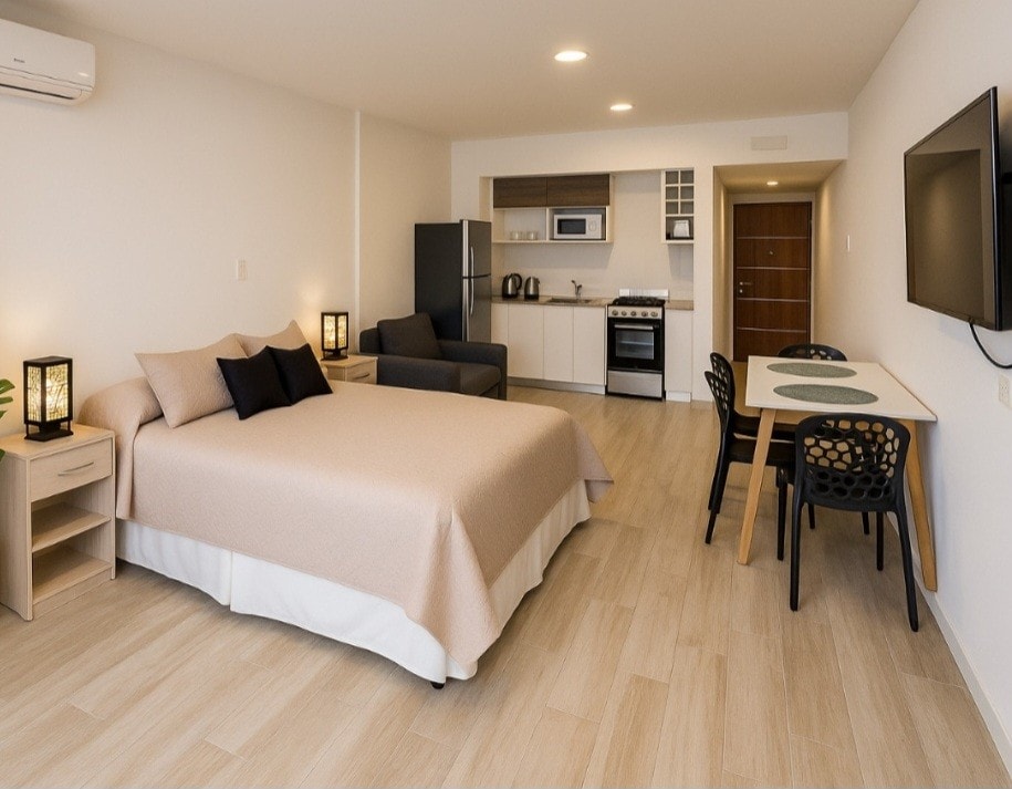 Disfrutá de una expMonoambiente Premium en Centro – Pileta, Quincho y Co- Working. Disfrutá de un monoambiente moderno y luminoso, totalmente equipado, con pileta y quincho para tus momentos de relax. Cuenta con una cama de dos plazas y la posibilidad de agregar una cama adicional de una plaza, balcón con vista a la ciudad y una ubicación inmejorable: cerca de bares, restaurantes y todo lo que necesitás. Ideal para estadías cortas o largas.