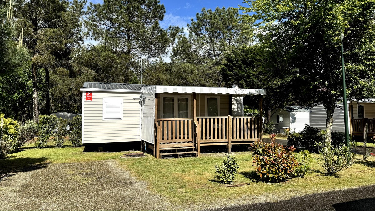MH panorámica nueva superaislada, todas las opciones 40 m2 terraza cubierta. Persianas opacas, mosquitera en los dormitorios, aire acondicionado empotrado en la sala de estar y los dormitorios/lavavajillas integrado/lavadora/TV de 108 cm, cuarto de baño con toallero eléctrico. Ropa de cama bajo petición. Productos/material de limpieza/papel higiénico, material de puericultura proporcionado. Juegos, libros, bolas de petanca y raquetas de playa para unas vacaciones con todas las comodidades. Bienvenida personalizada por los propietarios de las Landas (horario de día) y/o caja de llaves en el MH