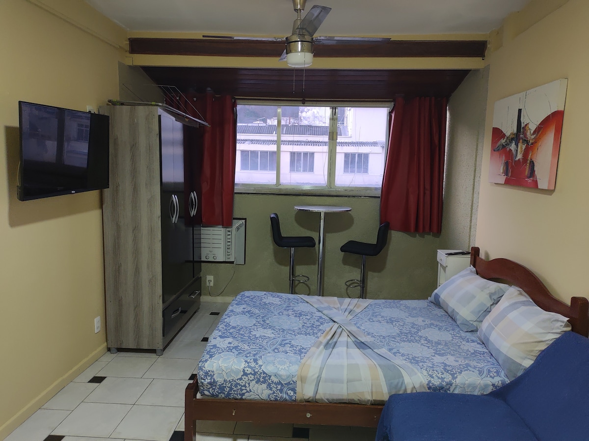 Este acogedor apartamento está en el corazón de Copacabana, cerca de la playa, metro, autobús y todas las comodidades que ofrece el barrio. Renovado y con muebles a medida que proporcionan más comodidad y espacio. La suite es el lugar donde los huéspedes podrán descansar y relajarse para disfrutar de la ciudad. Consta de un sofá retráctil de 3 metros, que sirve como cama doble auxiliar, TV de 65 pulgadas, zona de escritorio, minibar y cama cómoda. Ventiladores y aire acondicionado.