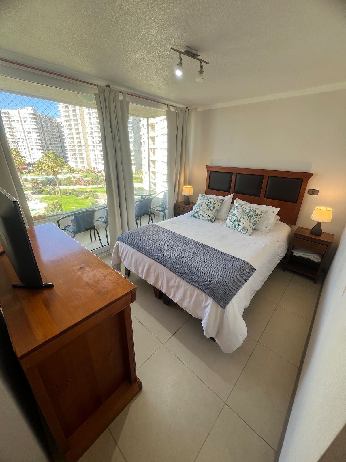Depto de 78 mts 2 3 dormitorios 2 de ellos con camas de 2 plazas y el tercero con 2 camas de 1 plaza 2 baños, cocina independiente. Full equipado (incluye toallas, sábanas blancas, shampoo, jabón, secador de pelo.) 2 TV de 48” con Internet cable, Netflix. CDF HD Premiun 165- Standard 855-HD Con malla de protección en todos los ventanales. Ascensor, Lavandería, conserjería las 24hrs, estacionamiento privado, piscina. Ubicado costado del Casino Enjoy, paso directo a la avenida del Mar.
