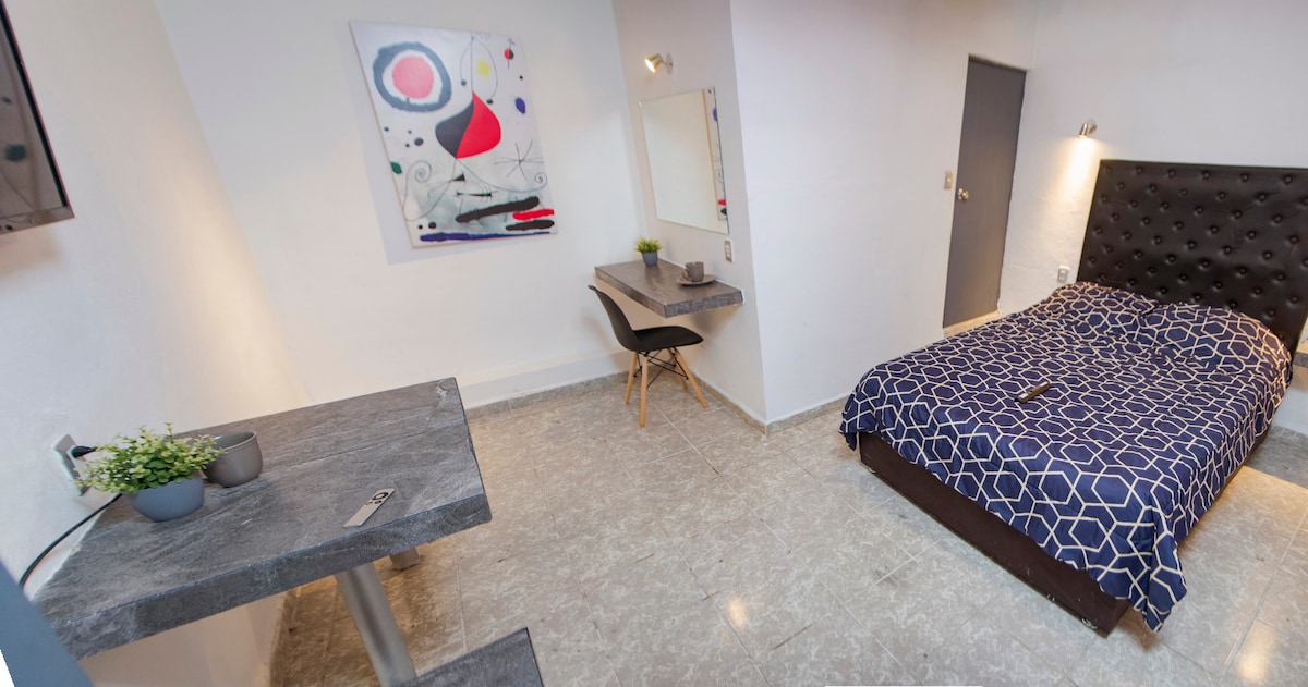 Ubicado en una zona estratégica, nuestro espacio ha sido diseñado para ofrecerte comodidad, tranquilidad y una experiencia inolvidable. Dusfrutarás de una habitación confortable con una decoración moderna y cálida, equipada con aire acondicionado, WiFi , Smart TV, frigobar, cocineta, y áreas comunes pensadas para el descanso y la convivencia. Nuestro alojamiento está cerca de puntos de interés, restaurantes y centros comerciales, permitiéndote explorar y disfrutar la zona con facilidad.