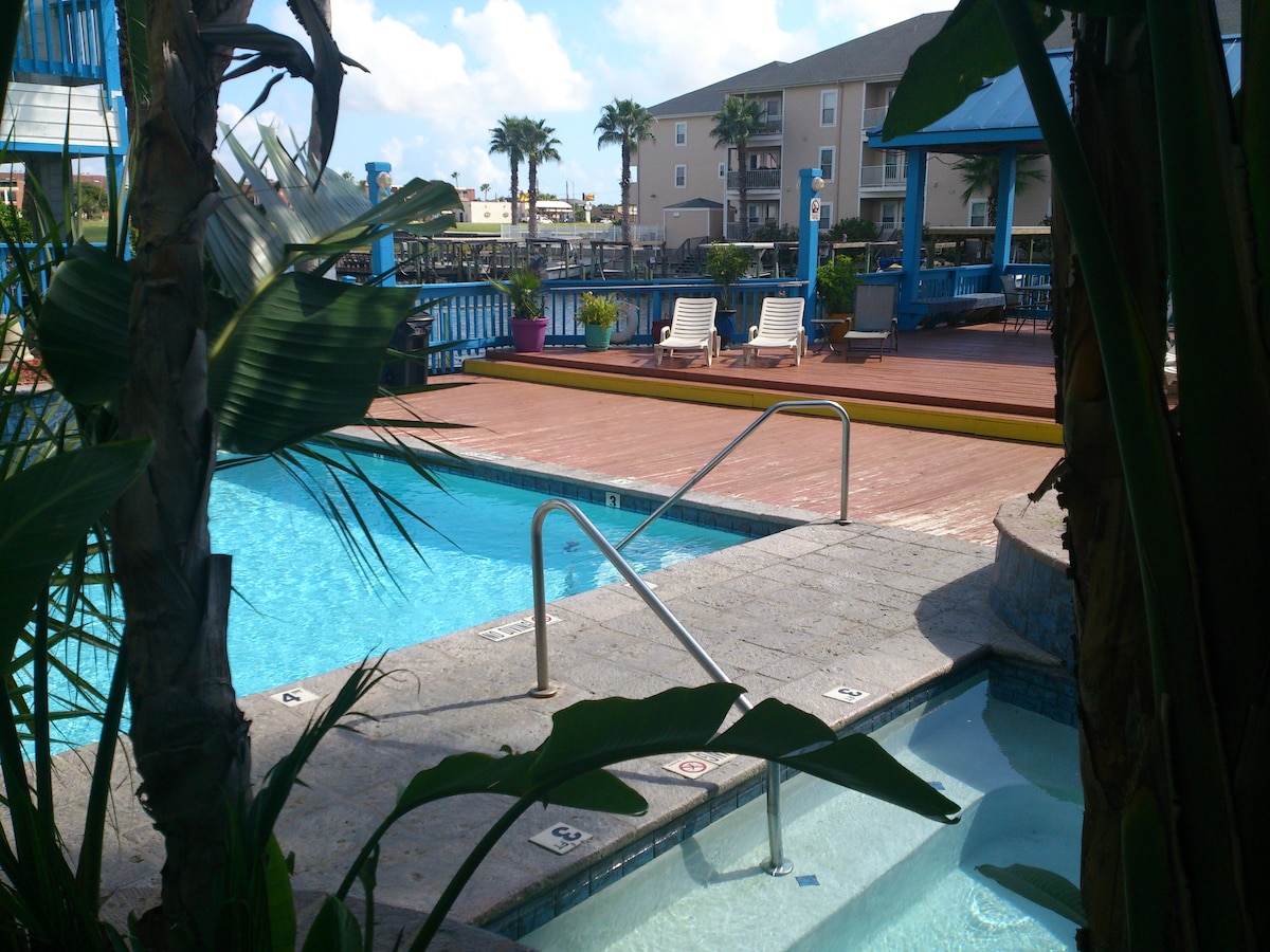 ¡Hermoso loft estudio con magníficas vistas al agua! Comienza y termina el día con tu bebida favorita en el patio privado con vistas al canal más ancho de la isla. ¡Disfruta de tu tiempo en la zona de la piscina, pesca algo en la terraza o admira la puesta de sol mientras asas la cena! Aparca tu barco en uno de los amarres o deja que tus hijos aprovechen el gran parque que hay al final de la calle. ¿Necesitas unas vacaciones en la playa? Carga el coche o alquila un carrito de golf y haz el viaje de 5 minutos hasta Whitecap.