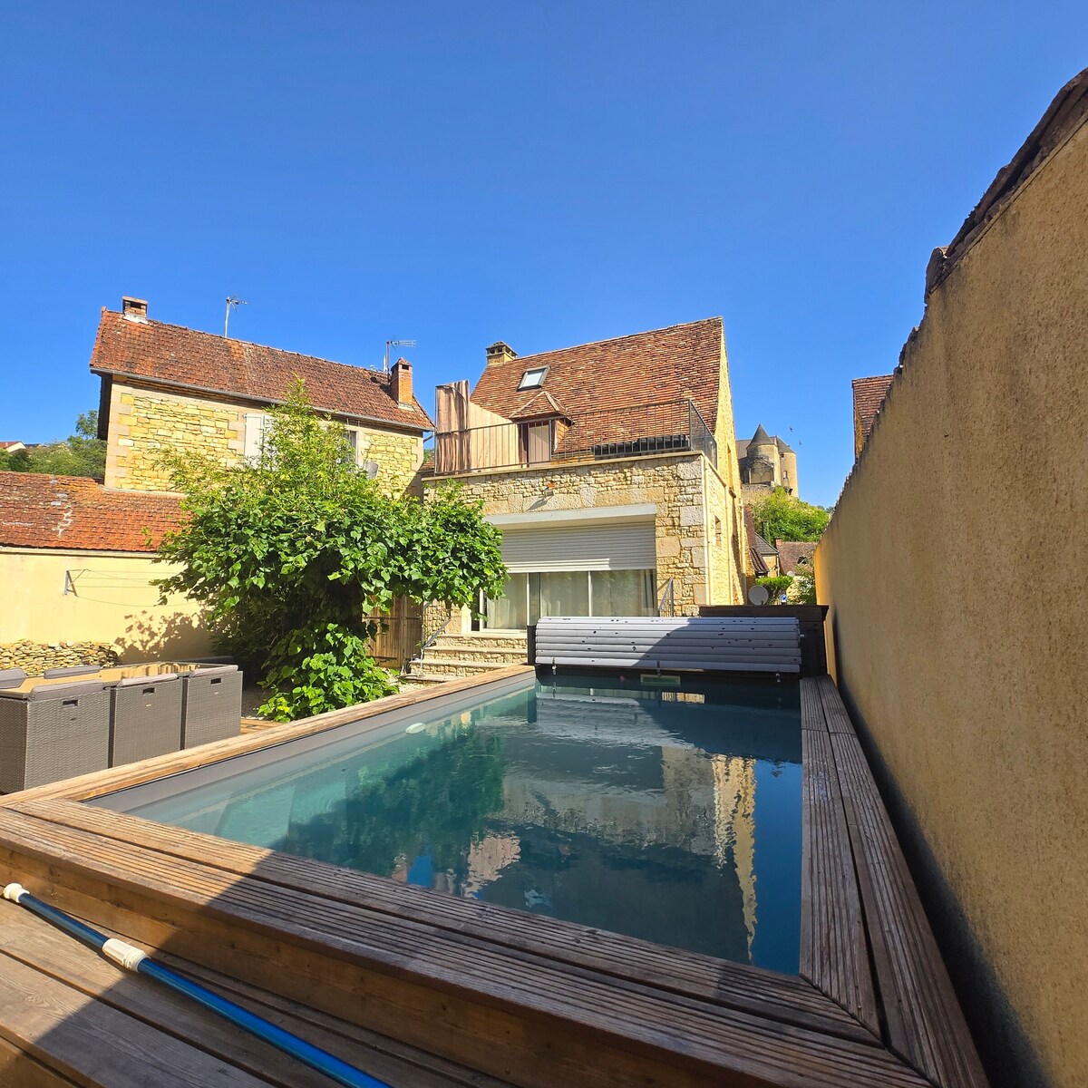 Our holiday home is based in Ladornac, a charming little village situated at the heart of Périgord Noir, between Sarlat, Lascaux, Les Eyzies and the Vézère river. You will enjoy the large secured and heated pool to relax after a day of sightseeing, hiking on the tracks directly accessible at the foot of the house, or canoeing on the nearby Vézère. You will share warm moments, aperitifs and meals with family and friends on the terrace under the large pergola protected from the sun. Welcome !