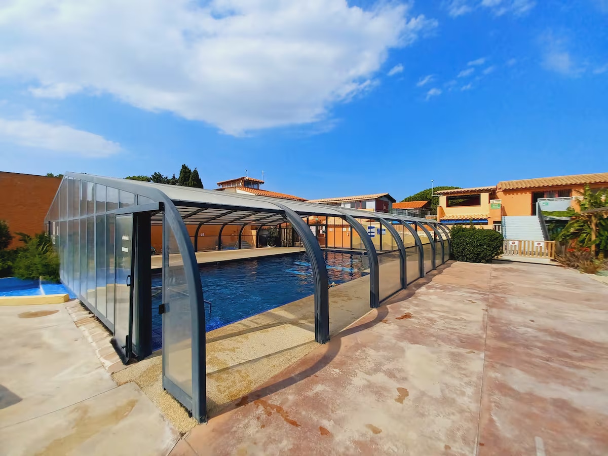 Front de mer ⭐ Accès plage privé à 50 m – Mobil-home haut de gamme climatisé (6/8 pers.) dans camping 4★ Terrasse fermée, 2 salles de bain, 2 TV + Netflix, parking privé – Idéal familles & couples MAR ESTANG SIBLU VILLAGE 4⭐ CANET-EN-ROUSSILLON 3 piscines WIFI gratuite Pétanque Soleil Toboggans Club enfants Location vélo Etang Randonnées Balades Machine bière & glaçons Four électrique Plancha grill Linge lit, serviettes fournis MENAGE INCLU Lave-linge Lave-vaisselle Machine à bière, à glaçon