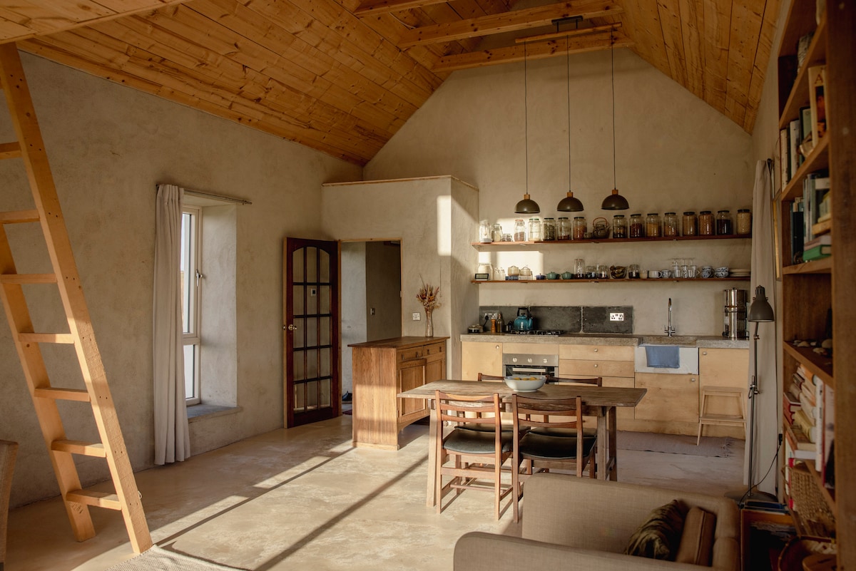 Recientemente renovado, este elegante granero de planta abierta se encuentra en el idílico paisaje rural del condado de Clare. Colinda con mi casa de campo de piedra de 150 años de antigüedad y ofrece un espacio vacacional independiente ideal para aquellos a los que les gusta la paz y la tranquilidad «fuera de lo común». El uso inteligente del espacio significa que tienes tu propia cocina, comedor y zona de dormitorio con una pequeña ducha/inodoro en suite y la sala de estar incluye un piano de cola Bluthner único para los amantes de la música.
