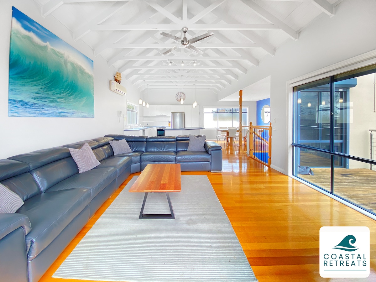 Family Foreshore Beach House. Tucked at the end of a quiet culdesac this relaxed foreshore hideaway is made for barefoot holidays. Wander to rock pools, play on the lawn, watch wallabies graze and kookaburras laugh in the trees or gather on the deck as the BBQ sizzles and waves roll in. Two living areas give families space to spread out while cosy bedrooms invite slow mornings with sea views. A fully equipped kitchen makes longer stays and entertaining a breeze your island home away from home