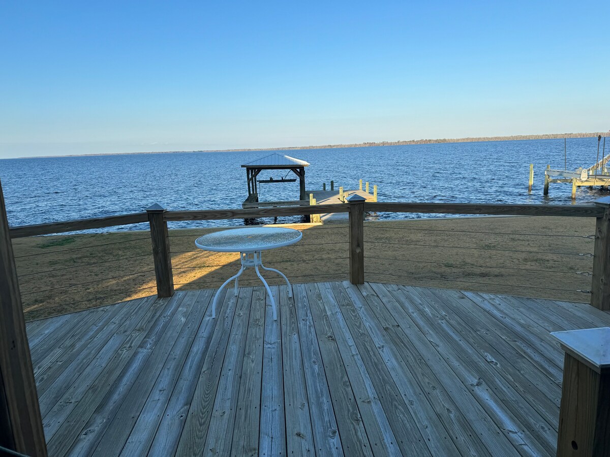 Enjoy amazing sunsets while relaxing in the (new) hot tub. Kayak on the Abermarle sound and soak in the natural beauty. Private dock, WIFI, incredible views from every room. Pet friendly. Remodeled bathroom, new gourmet gas stove, new hot tub. Fishing on private dock. Roku TV for watching your favorite shows or movies. Large kitchen with all you need to make a romantic meal. “Let’s do Sunset” is the perfect couples retreat for a quiet, relaxing and romantic getaway