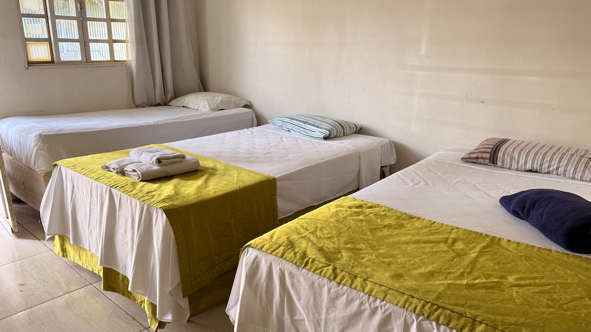 Venha descansar no Goiás! Casa rústica e simples perfeita para relaxar com a família, fazer fogueira e aproveitar o fogão a lenha e uma experiência linda pra quem gosta de se sentir longe do agito da cidade. A casa conta com uma suíte ( com uma cama de casal e frigobar), um quarto (1 cama de solteiro), na sala temos um sofá cama super confortável capaz de suportar até 2 pessoas. O quintal tem várias árvores frutíferas que você está livre para consumir com sua família!