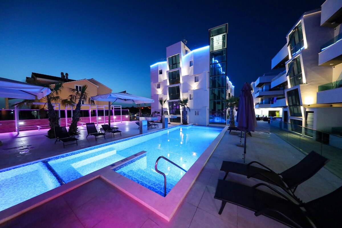 El Boutique Residence Cosmopolis es un hotel lujoso rodeado de 2 grandes piscinas. En su oferta incluye un juego con billar, dardos, futbolín, amplio parking, gimnasio, hidromasaje jacuzzi. Los alojamientos están amueblados de forma moderna. El aeropuerto de Zadar está a 10 minutos en coche y el centro de la ciudad de Zadar, todos los parques nacionales más famosos están cerca, la playa más cercana está a 5 minutos a pie de los apartamentos