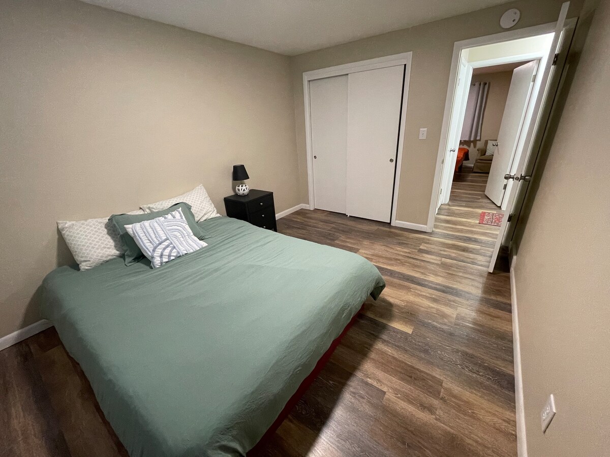 Hermosa suite amueblada soleada en el sótano de nuestra casa. Entrada compartida. Privada y tranquila. Cocina pequeña: placa calefactora de 2 quemadores, horno tostador, microondas, cafetera, nevera, utensilios, ollas y sartenes, mesa de cocina y sillas para niños, cómodo sofá y silla a juego, TV de pantalla grande, acceso WI-fi, baño privado con 2 lavabos, ducha, bañera, dormitorio completo amueblado, lavandería compartida. Tenemos un perro pequeño y un gato animado. El perro ladrará cuando entres, pero nunca muerde.