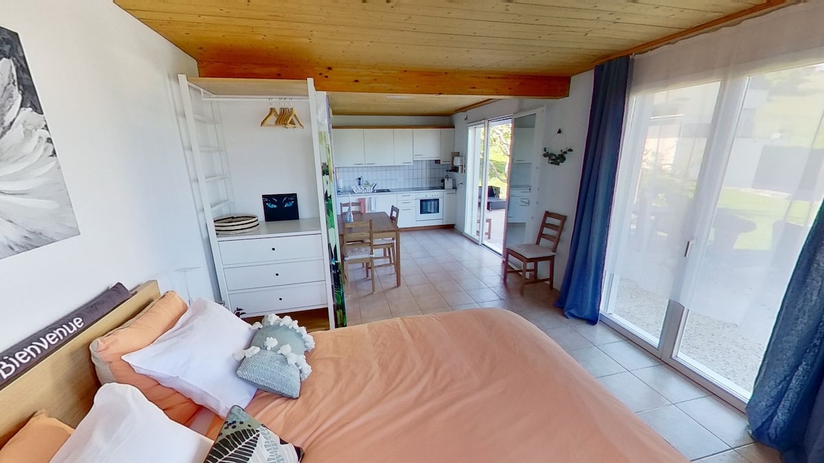 Estudio de vacaciones situado en un lugar tranquilo con gran terraza con vistas al lago de Morat Televisión y Wifi rápido, cocina con nevera,cafetera,tostadora Plaza de parque cubierta + plaza para bicicletas Situado cerca de los viñedos, a 2 minutos de una parada de autobús Panadería, carnicería y supermercado a 10 minutos a pie Playa más cercana a 1.5 km, playa de Avenches a 5 km Todo el material para parrillas está disponible