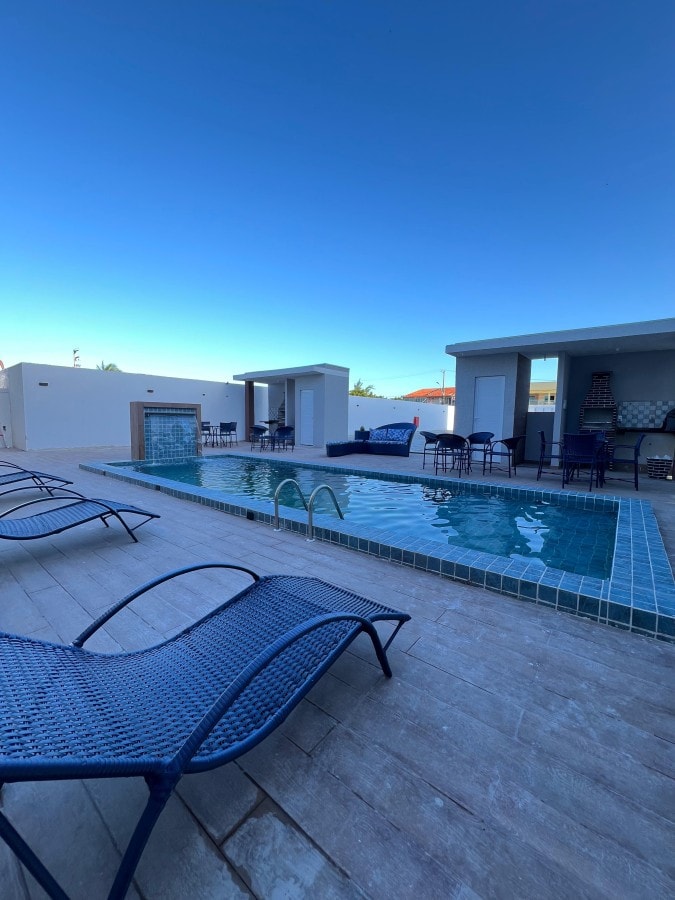 Casa con 6 suites, 1 dormitorio extra, comedor, sala de estar, cocina equipada y gran área con barbacoa. Tenemos un amplio jardín con espacio para alojar a las cometas. Con 6 camas, cocina, zona de barbacoa, piscina y gran lugar para la cometa. Voltaje: 220V