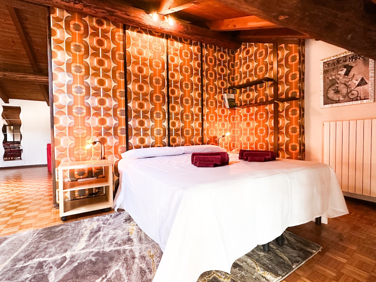 Amber & Love Loft es un refugio romántico en el corazón del centro histórico de Cuneo. Las vigas a la vista, los muebles cálidos y los detalles artísticos crean un ambiente íntimo y acogedor. El sillón rojo y los cuadros inspirados en la cerveza aportan personalidad y originalidad. Ideal para parejas, viajeros o familias que quieran experimentar Cuneo con encanto, comodidad y autenticidad.