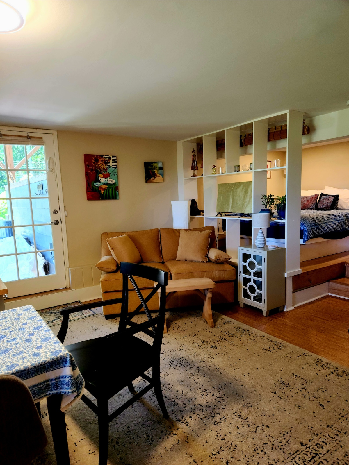 Comfortable and warm garden studio a 3 minute walk to the best beach on Salt Spring,a 10 minute drive to Ganges and a short walk to a beautiful forested area. Stylish furnishings, soaker bathtub and Netflix on the TV, makes this the perfect base for your island adventure. It has its own private entrance and covered patio. The suite is in a house where the host family lives, so guests may hear occasional footsteps. Paddle board rentals available and I transport to beach or lake for you.