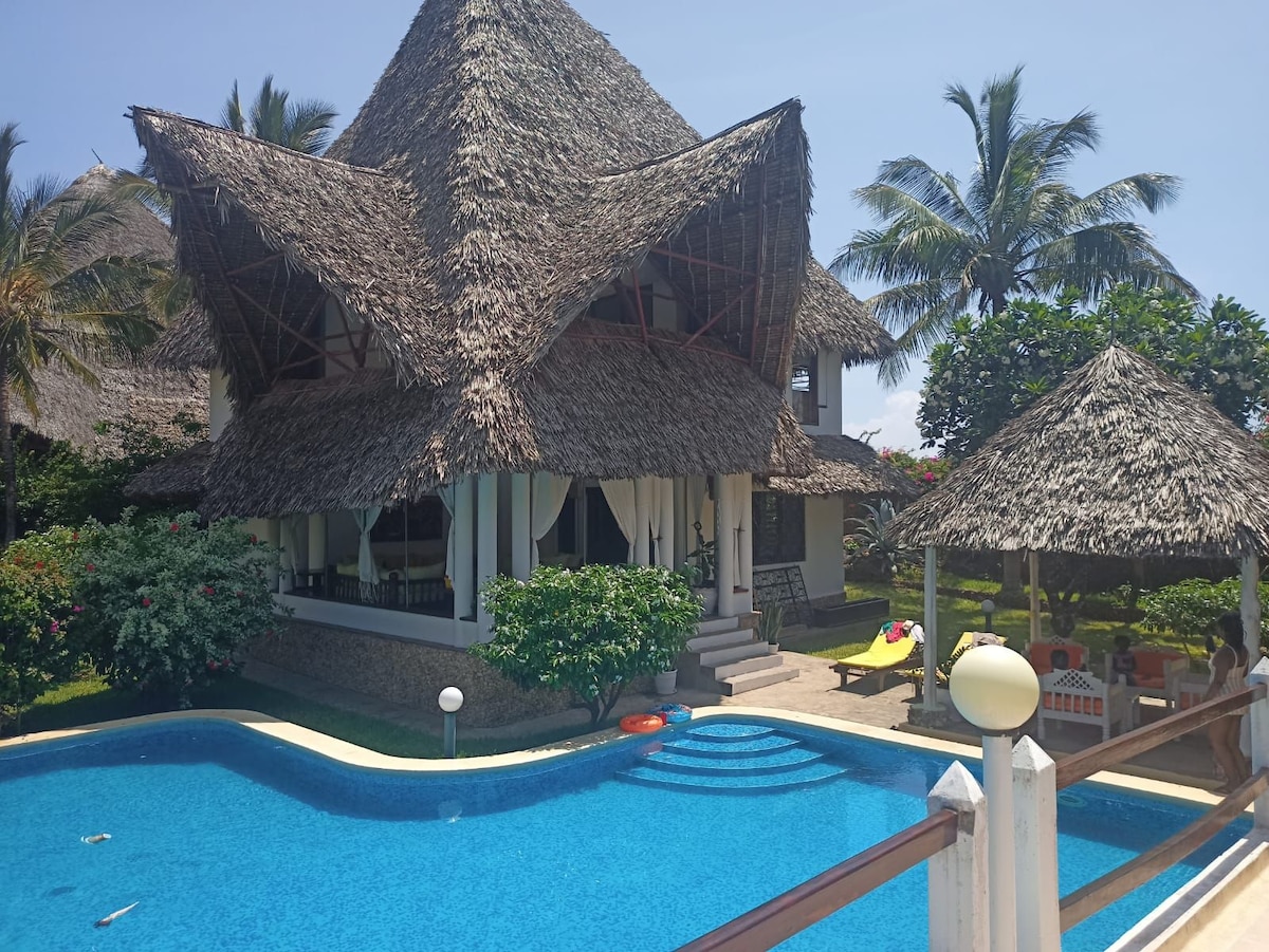 Bienvenido a nuestro lugar favorito. Nuestra casa privada con techo de makuti estilo árabe-swahili está en un promontorio con vistas al mar en la playa en Mayungu, a 25 minutos del aeropuerto de Malindi. Estamos en la primera fila, con unas vistas impresionantes al mar, una gran piscina, un buen personal, un buen cocinero y un montón de lugares para relajarse, y tenis de mesa y una mesa de billar. La casa tiene capacidad para 8 adultos más niños a los que les encantarán los rompecabezas y la piscina. 4 dormitorios están en suite y 2 habitaciones para niños pequeños comparten ducha.