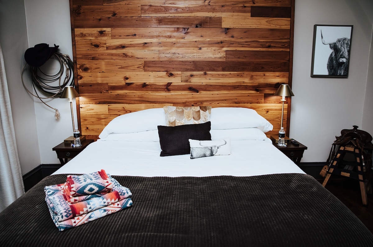 The Adair is a private suite inside The Gaston, a boutique bed & breakfast in historic East Dallas. This cowboy-inspired retreat features a plush king bed with luxury linens, rich leather and wood accents, and a spa-style shower. Equal parts rustic and refined, the suite blends Texas warmth with modern elegance for a truly memorable stay.
